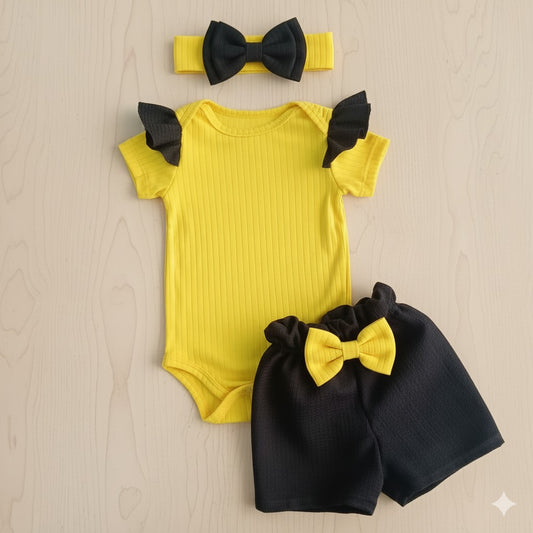 Conjunto Bebé Amarillo con Negro – 3 Piezas (Body + Short + Cinta)