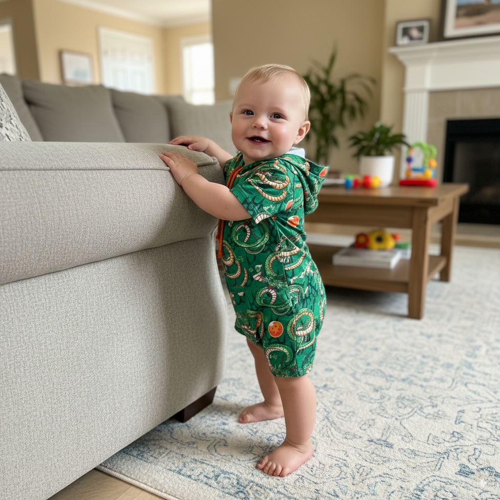 Este increíble conjunto de camibuzo con capota y short es perfecto para los pequeños aventureros. Con un vibrante estampado de dragón sobre un fondo verde esmeralda, tu bebé destacará con un look lleno de energía y estilo.