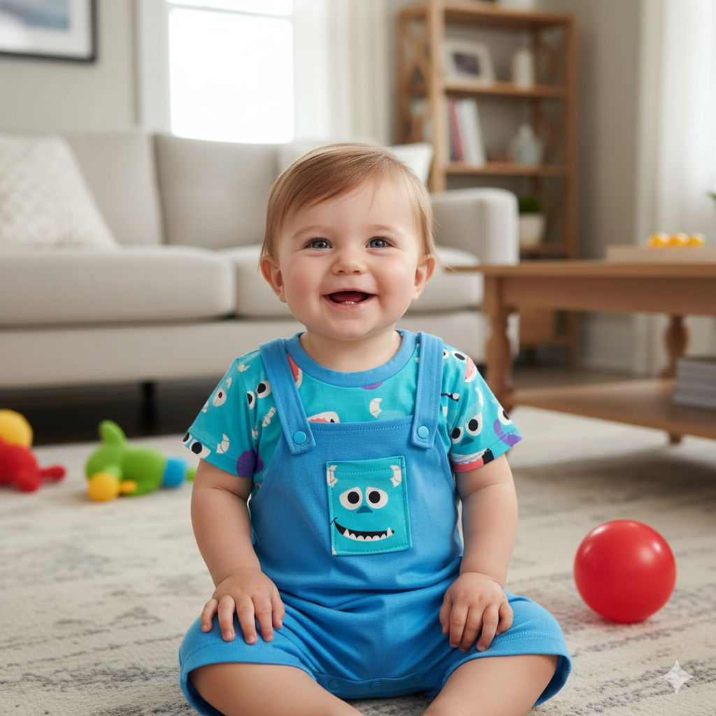 Conjunto infantil de overol y camiseta con estampado de monstruos, ideal para un look divertido y cómodo.