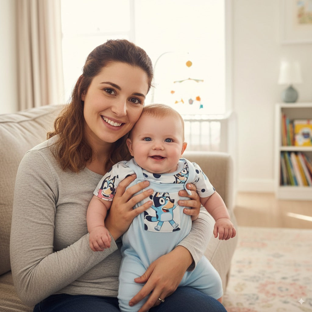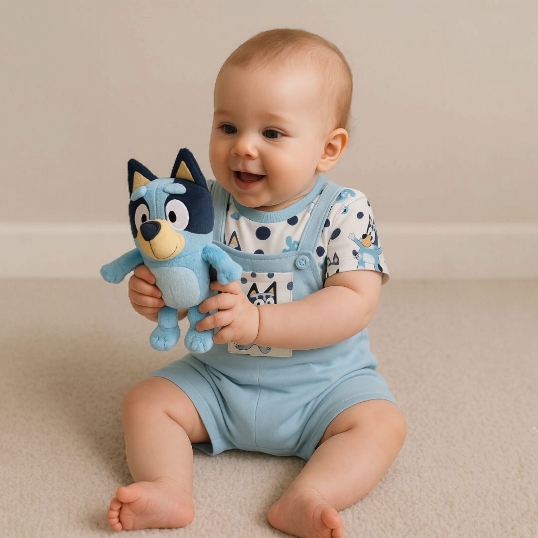 ¡Luce a tu bebé con este adorable conjunto de enterizo azul pastel y camiseta estampada con su personaje favorito! El diseño incluye un overol corto con tirantes y broches a presión, combinado con una camiseta de algodón suave decorada con divertidos puntos y un personaje animado. El bolsillo frontal también lleva un detalle del mismo personaje, haciendo que este conjunto sea aún más encantador.