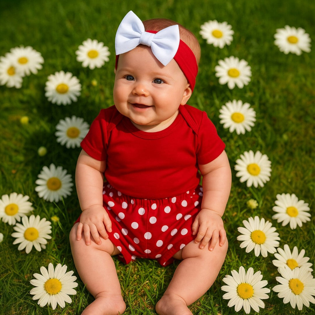 ¡Tu bebé se robará todas las miradas con este adorable conjunto estilo retro! Compuesto por un body rojo intenso, un short con estampado de lunares blancos y una linda diadema con moño blanco, este set es perfecto para ocasiones especiales o simplemente para verse precioso cada día.