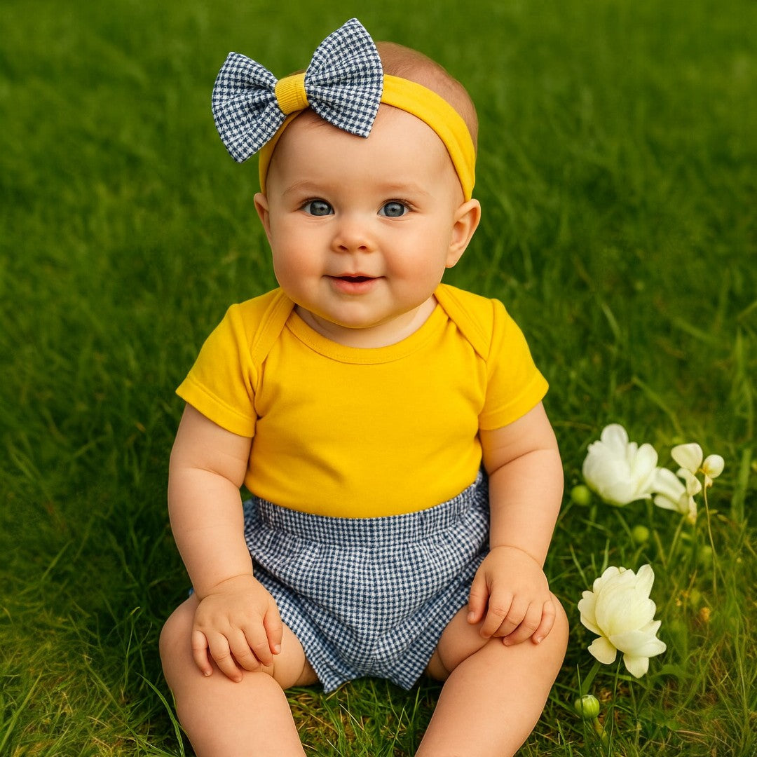 ¡Dale un toque alegre y clásico al guardarropa de tu bebé con este encantador conjunto de 3 piezas! Incluye un body de color amarillo vibrante, un short estilo bombacho con estampado de cuadros azul y blanco, y una tierna diadema a juego. Ideal para días soleados, salidas al parque o sesiones de fotos inolvidables.