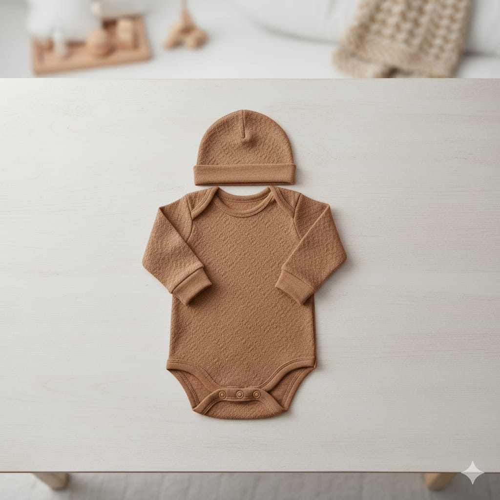 Body y Gorro Café/Marrón Claro: Un tono tierra natural que transmite ternura y confort.